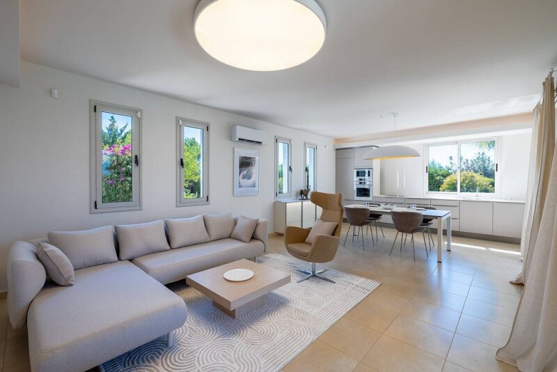 This stylish and modern villa, located in the desirable Secret Valley resort area of Kouklia, offers breathtaking panoramic sea views. The villa has been renovated to an exceptionally high standard and is fully furnished, ready for immediate occupancy. The property features four bedrooms, including one on the ground floor and three on the first floor, each with its own bathroom. On the basement level, you'll find a practical dressing room with a designated laundry area. The house is equipped with an electric heating system, and additional underfloor heating has been installed in all bathrooms for extra comfort. Each room is fitted with modern Mitsubishi air conditioners to ensure a comfortable living environment throughout the year. The roof is equipped with state-of-the-art solar panels, highlighting the villa's commitment to energy efficiency. Outside, a sparkling swimming pool with a dedicated recreation area sits right in front of the house. The villa is surrounded by a beautifully maintained garden with an automatic irrigation system, ensuring lush green surroundings year-round. This property offers a perfect blend of modern luxury and convenience, set in a serene yet accessible location.
