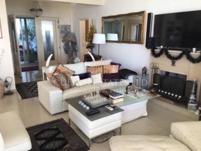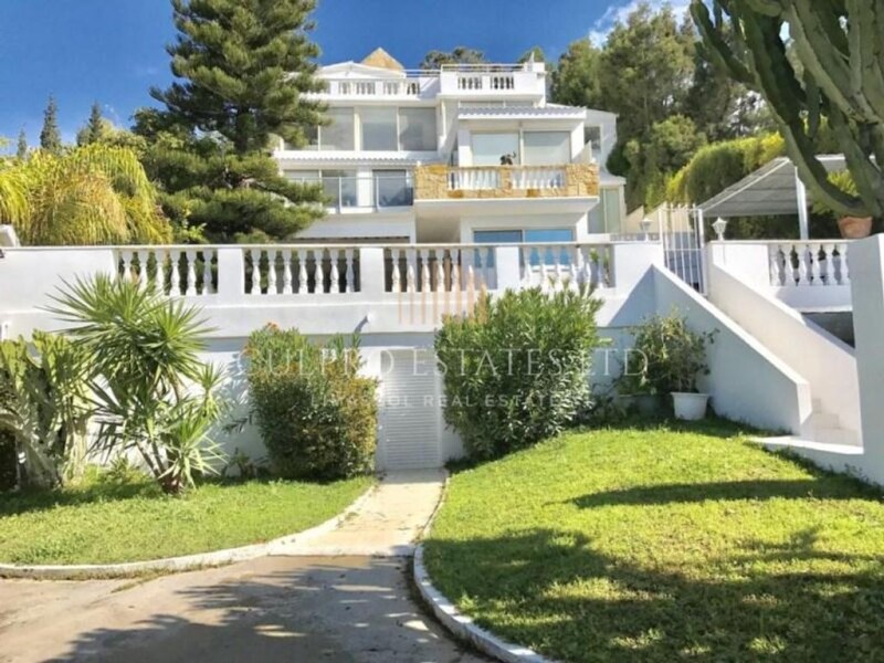 Super luxury villa with breathtaking unobstructed sea & mountain views in one of the most exclusive residential areas of Limassol, 2 minutes drive from the beach, close to all amenities. This new & modern executive villa is on top of a hill with stunning views and consists 7 en-suite bedrooms, large sitting rooms, dining areas with a wood burning fireplace, built in plasma TV, DVD, satellite, surround system, double glazing, fully air conditioned. Kitchen is complete with modern oven, hobs, dishwasher and microwave, large fridge, water dispenser hot and cold, washing machine. Fully equipped gym, sauna/steam bath with roof garden overlooking the sea. Outside sauna hot tub for 6 people, big swimming pool 10 x 4, with wooden deck, mature gardens and green lawns. There are 5 double bedrooms (all en suite with baths & water jet showers & Jacuzzi) all with stunning sea views and one single bedroom also en-suite. There is an inside elevator (lift) from the swimming pool level to the first floor. Additional w/c. On the top there is roof garden with sun beds and a fully equipped gym (treadmill, bicycle, weights, weight bench and steam bath and sauna). The villa can accommodate up to 13 people. There is no V.A.T. - Air conditioning - Elevator - Garage - Pets allowed - Swimming pool - Hot tub - Fireplace - Smoking allowed - Furnished - Balcony - Terrace - Garden - Covered parking - Grill - Gym - Tennis court - Patio - Dishwasher - Washing machine - Dryer - Handicap accessible. Villa is rented until September 2024.