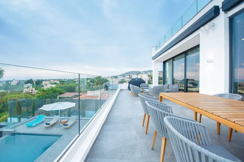 This private residence is situated on an elevated vista overlooking Pafos coastline as far as an eye can reach. Majestic views of the Mediterranean decorate every living space. Every detail of this extraordinary property is well-designed and perfectly executed. Impressive technical specifications of this residence - from a full smart house to a carefully designed ambient lighting system - are running on 20 kW photovoltaics, ensuring responsible energy consumption without a single compromise of comfort levels for homeowners. Features like throughout underfloor heating, impressive fireplace, fully functional South facing verandas with expansive shading systems, gym and a separate studio-style space with a kitchenette accessing the pool area - all this makes the residence perfect for all year living. The stylish gardens are meticulously maintained and create privacy. There are two main enormous verandas overlooking the Med in all its glory - the one on the upper level is decorated with an impressive water feature and playful lighting solution, extending the master bedroom’s space. The second - at the entry level - continues as a deck of the living and dining space right into the view. The main relaxation area by the pool is on the lower level: the 5 x 11 mètres emerald colour tiled infinity pool is decorated by refreshing water cascade features and is well-lit during the evenings. It is the perfect place for enjoying those famous magnificent sunsets of Pafos. The residence comes fully furnished with a sophisticated choice of furniture, carefully selected lighting, a well-equipped branded kitchen and a superb collection of contemporary art pieces that tell a story of colour, life and joy. The enclosed automated garage has ample space and can accommodate 2 cars plus.