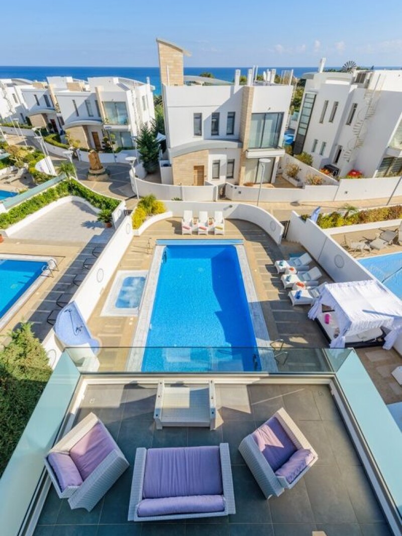 We are proud to present this luxurious villa, one of the most prestigious well presented properties located in the most exclusive beach front gated community in the Protaras area. This Villa is Located in Protaras, between the famous Fig Tree Bay and Konnos Bay, nestled on its own private sandy beach this modern home makes the most of Cyprus’ sunny climate comfortably catering for up to 11-12 guests. The residence comprises of 4 levels, with private gated access, video entry systems, underground garage with private entry, private gym & private internal lift providing access to all floors (except the roof terrace which is accessible via internal stairs), ground level access for pedestrians accessible only via secure gates, private beach access again via secure gate at the bottom of the garden / very good size pool area with comfortable outdoor furniture, overflow heated swimming pool with roman steps and a jacuzzi, 60 sq meter roof garden with wondrous sea views / outdoor dining area / BBQ area with bar / relaxing chill out area. In the basement – and the driving access to the property there is large garage (up to 3 cars) with a private gym. Here you will gain direct entry to the property firstly with access to a cinema room with projector and surround sound with comfortable seating area with a small equipped kitchenette. On this level there are two bedrooms, 1 very comfortable twin bedroom and a spacious single room, both with use of a shower room and W/C. Going up by stairs or lift, it will lead you to the ground level, which is a bright open plan living area opening directly to the pool area, and re-garden relaxing, dining area. There is a fully equipped kitchen, breakfast bar, comfortable living area with fireplace. The pool is a major focus of the property and comprises several comfortable seating area, loungers, poster beds. The more discreet back garden offers brilliant shade and sun at various points of the day and can be used for sun bathing, lounging, dining, BBQ’s. There is a very comfortable double bedroom located on the ground floor with its own en-suite, access to the gardens, and is fully equipped like all bedrooms with a Plasma TV, satellite and all the extra home from home comforts. The first floor is the main bedroom level with a further 3 bedroom. Each bedroom has its own en-suite and is tastefully decorated offering plenty of wardrobe space wardrobe space, plasma TV and satellite channels. The master bedroom is located at the front of the property with a private balcony overlooking the pool area with sea views, the en-suite also comprises a feature shower. On the top floor you will find the private roof garden which offers a great outdoor living space, to sun bathe, to relax with a book, to enjoy in the evening for drinks. All with a beautiful view of the forrest area behind and the sea in front.