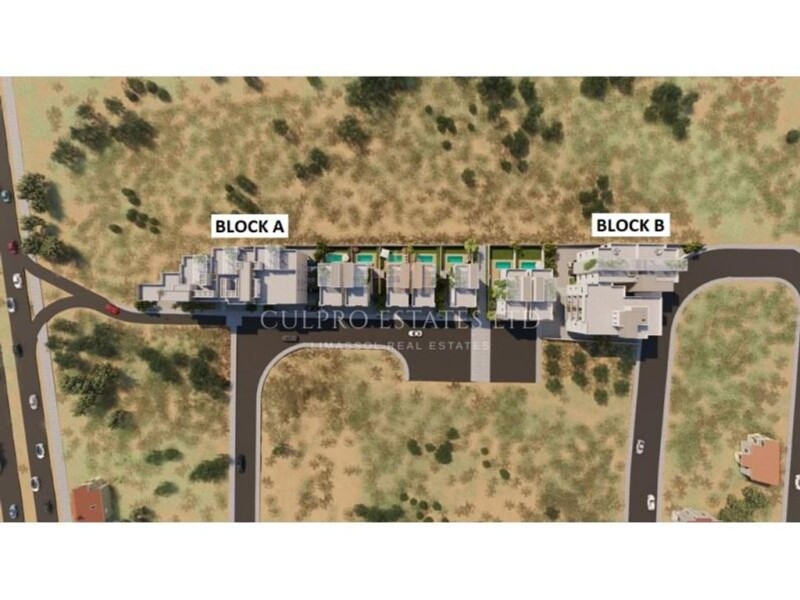 Modern complex consisting of 2 block of apartments and 7 villas located in Aradippou, Larnaca. 5 minutes drive to Larnaca International Airport. 10 minutes walk from the new Metropolis Mall. All amenities in 10 minutes walk (cinema, bakeries, supermarket, bank). Easy access to the highway. - Quiet neighborhood - Panoramic views - 1, 2 & 3 bedroom apartments - 3 & 4 bedroom villas - Energy efficient category: A - Storage rooms - Covered parking spaces. The property is subject to VAT. Block B: Delivery October 2024. Block A: Delivery January 2025.