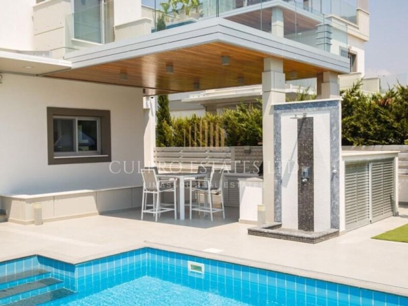 Modern 4 bedroom villa is located in the prestigious area of Agios Tychonas, close to all necessary amenities and infrastructure and within easy reach to the sea, just 1000m. Plot area: 590 sq.m. Internal area: 275 sq.m. The villa consists of three floors plus covered roof garden and four bedrooms in total, plus one maid's room / guest studio. Villa is fully furnished and equipped. PROPERTY FEATURES: - 3 bathrooms + 1 guest toilet - Maid's room / guest studio - Laundry room - Covered garage for 2 cars plus motorcycles - Mature landscaped garden with covered BBQ area - VRV- air conditioning, split-systems. The machines are located on the roof. - Underfloor heating for each floor, Air Heat pump, Diesel Heater, control unit from Siemens - 3-phase Photovoltaic hybrid system, 10 kW - Alarm System, CCTV cameras, Electrical provisions for SMART home - Heated swimming pool ready for salt water, electrical safety cover, Jacuzzi/Hot Tubs - Separate Title Deed. Non-Mortgaged Property. The property is ready for transfer.