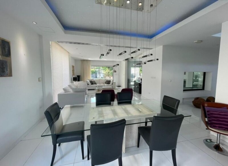 The property is a six bedroom house with an elevator and pool is located in a quiet residential area of Panthea, within easy reach of the Limassol highway. This amazing property finished to an exceptional standard sits on a 709 sqm plot and is spread over three floors, each floor having a total covered area of 200 sqm. This spacious home benefits from a one-bedroom apartment with its own entrance on the ground floor. There is also an ensuite bedroom, a large room currently used as a home cinema / gaming room on the same level. The main entrance is on the first floor, leading to a bright and attractive foyer boasting an aquarium. There are also two living rooms, two dining areas, one office, a first-class kitchen with luxury features, an office, and a guest cloakroom. This level enjoys access to a generous veranda and a lovely garden with a pool and shower/WC facilities. The second floor consists of 4 ensuite double bedrooms, including 2 with a walk-in wardrobe. There is also a room which is currently set up as a gym and a laundry room with a covered veranda. The property features 6 Bedrooms, incl. Master Bedroom en-suite bath-jacuzzi and walk-in wardrobe, 8 WCs, 6 showers 1 Bath/Jacuzzi ( All 1st floor bedrooms are en-suite + 2 basement bedrooms en-suite), electric shutters throughout, double glazing windows throughout, swimming pool, an outdoor Shower/Toilet- A/C throughout, secret lighting and spotlights throughout, garden area, 2 separate basement bedrooms with en-suite facilities, garage parking for 2 Cars + additional space uncovered.
